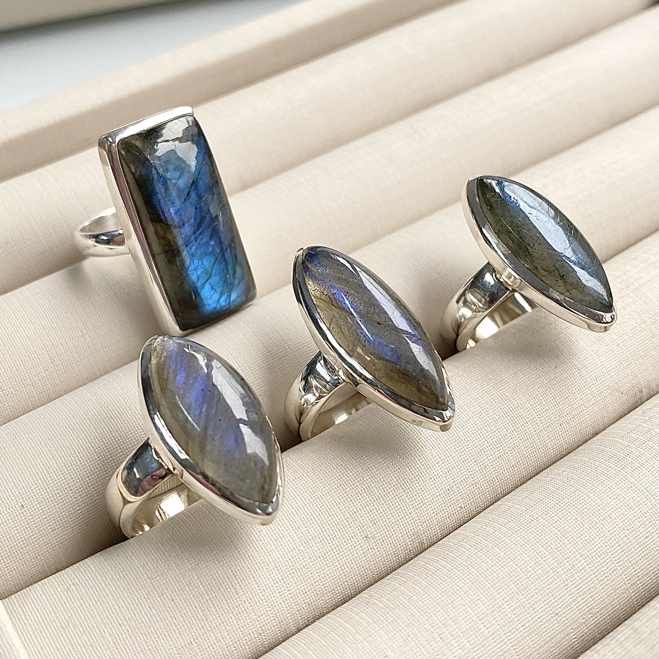 Anéis Bali Retangular e Navete. Pedra Natural Labradorita. Importado. PRATA – 925. Mediante Disponibilidade no Momento da Separação.