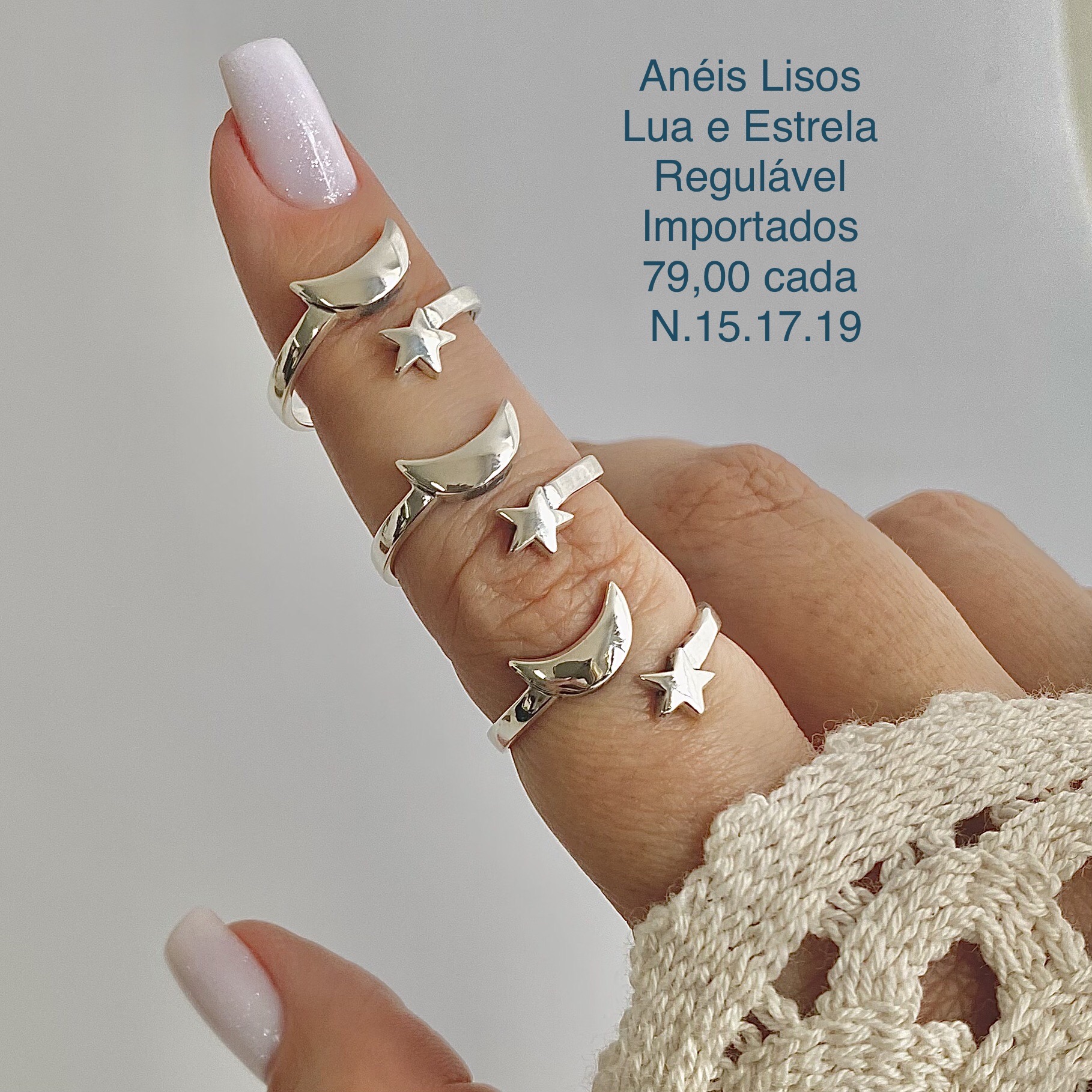 • Anéis Lisos Lua e Estrela Regulável. Importados. PRATA – 925. Mediante Disponibilidade no Momento da Separação.